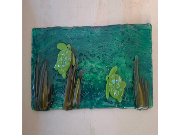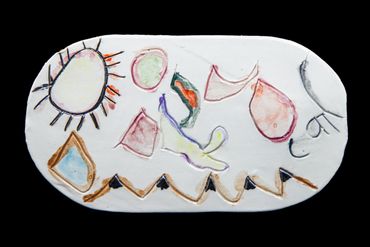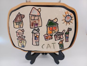 Of note is Cat's consistent ability to create images using underglazes, a medium in pottery that can give a water color quality. Cat uses underglazes in abstract as well as storytelling pieces. Her storytelling pieces include mountains and hot air balloons. As she explores new ways of applying underglazes she allows herself to take a beat, and think of her pieces. She also welcomes critiques which she applies to her work as she, the artist, sees fit!